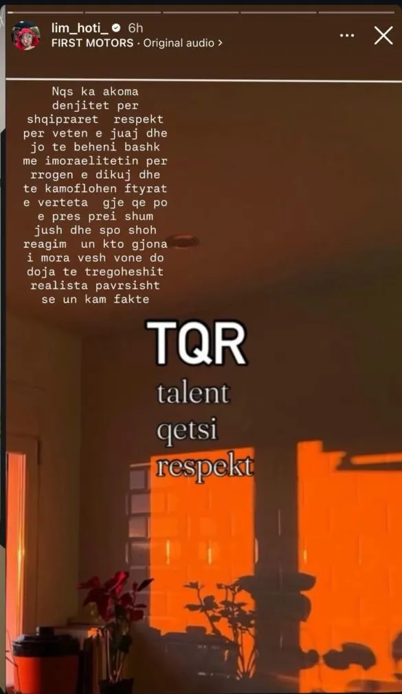 Çdo gjë nisi kur Lim Hoti postoi një storje në Instagram, ku kritikonte ashpër integritetin e shqiptarëve dhe sugjeronte se ka ende njerëz me fytyra të kamufluara. Në këtë postim, ai theksonte akronimin “TQR”, të cilin e përkufizonte si “Talent, Qetesi, Respekt”, duke shtuar se do të doja që të tregonte se ishte realist, pavarësisht faktit se ai ka fakte.