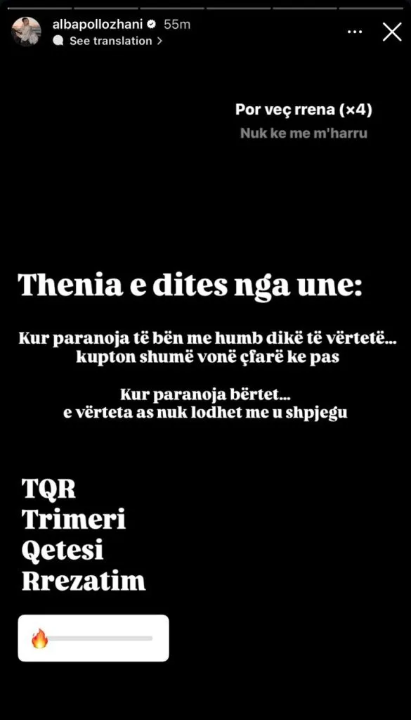 Duke vazhduar më pas me Story që fliste për paranojën, duke theksuar se “Kur paranoja të bën me humb dikë të vërtetë… kupton shumë vonë çfarë ke pas.” Ky postim dukej qartë si një reagim ndaj shkrimeve të Lim-it.